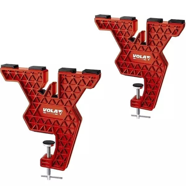 Cette paire d’étaux fabriquée par Vola est conçue pour entretenir dans des conditions de travail optimales les snowboards et skis larges.